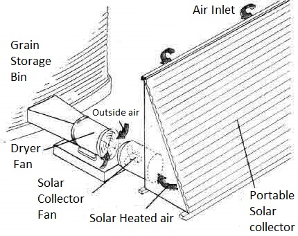 b. Solar drying: The heat transfer unit (absorber) in solar dryer absorbs the solar spectrum of radiation and converts radiation into thermal energy. In the direct mode of drying, solar energy is received directly by small batch of materials placed inside the dryer. Moderate air flow rate is maintained by natural convection where air is heated at 50 – 60°. In indirect mode of drying, materials inside the dryer do not get heat direct solar heat. First of all, drying air is preheated by sucking the air which then is passed to bed of material (grain) inside bin or storage house.