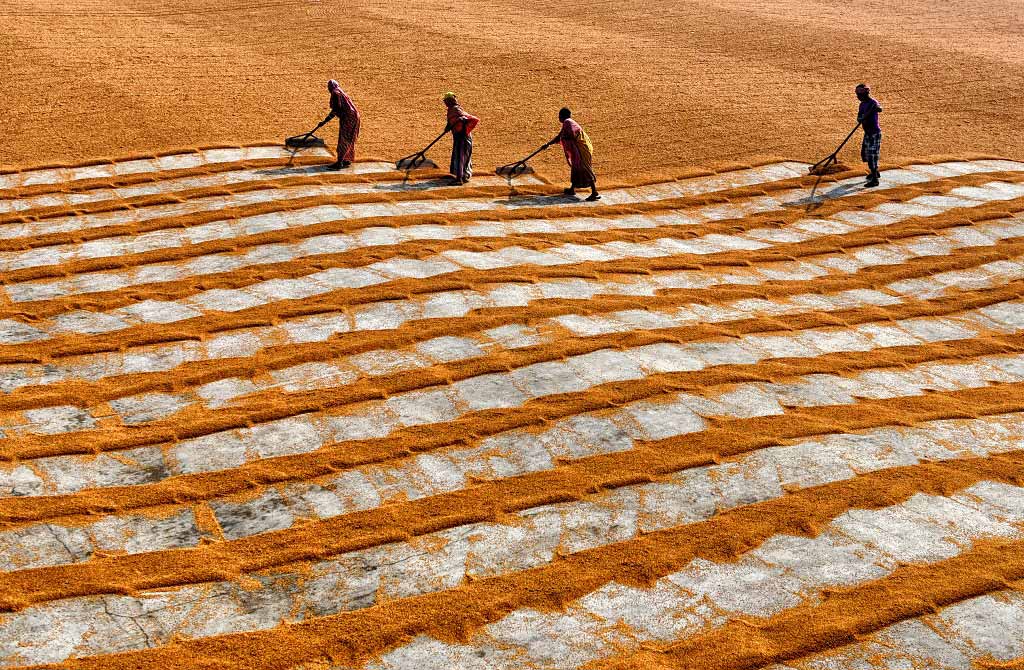 After grain are harvested and threshed, grains are spread in thin layer (3 -5 cm thick) either on the clean field, concrete floor or straw mats and sun basked. Regular spreading of the grain is required to achieve uniform drying. Generally, it takes continuous 2 – 3 days of sun basking to bring down moisture content from 20 – 22 % to 13 –14 %.